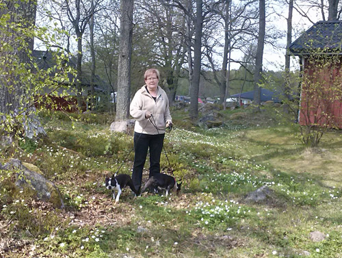 Aloitimme matkan Annelin ja kahden bostonimme (Lumi ja Sisu) kanssa Turusta, josta nousimme laivaan torstai-iltana. Aamulla olimme sekaisin kellonaikaa vaihtavien ja ei-vaihtavien kännyköidemme kanssa. Tästä joutui, että Anneli kävi hakemassa aamukahvit turhan aikaisin (n. kl. 04.00 yöllä). Ihmettelin koiria ulkoiluttaessani umpihumalaisen nuorison kännäyskuntoa, miten ne vaan jaksavat ja jaksavat. Kun oikea kellonaika paljastui saimme hysteerisen naurukohtauksen, josta ei meinannut tulla loppua. Mahtoi kahvilanpitäjä ihmetellä känniläisten joukossa olevaa selvää mummelia höpöttämässä että "ostaa kahvit jo nyt, että ehtii sitten juoda ennen laivan saapumista satamaan".